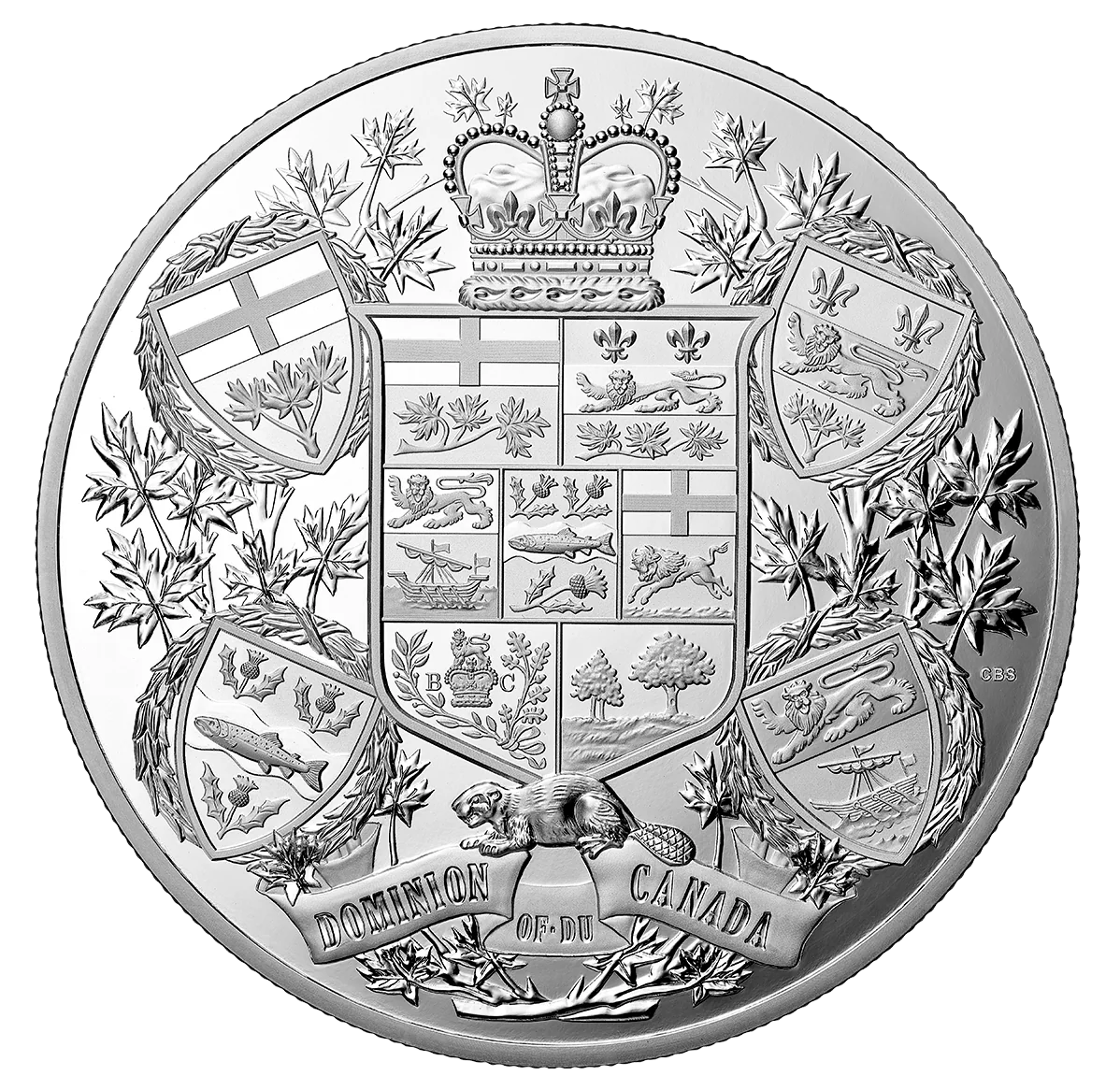 The reverse depicts the Seven Provinces Shield, featuring a crown and the arms of the seven original provinces. Below are a beaver and a bilingual "DOMINION OF/DU CANADA" ribbon. Flanking the shield in laurel wreaths are the arms of the four founding provinces.
