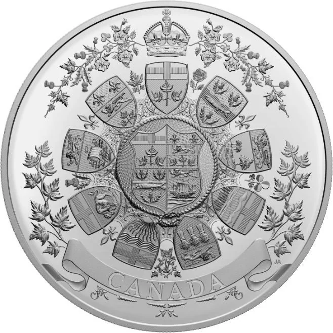 The reverse features an engraved heraldic design predating Canada's official 1921 Coat of Arms. Based on a drawing by Joseph Aubé, it shows Canada's quartered shield surrounded by the nine provincial coats of arms from 1912, topped by a stylized Royal Crown. The design is framed by symbols from Canada, France, and the United Kingdom, with a banner extending to the obverse.