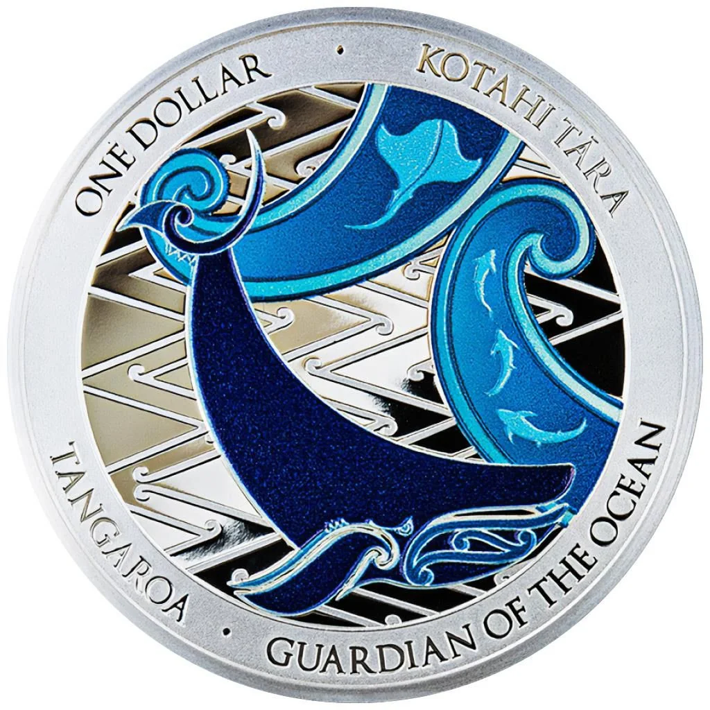 This pūhoro-style design depicts the realm of Tangaroa, ocean guardian. A central whale—considered a descendant of Tangaroa and a protector of sailors—symbolizes the safe passage of ancestors to New Zealand. Surrounding waves teem with sea creatures.