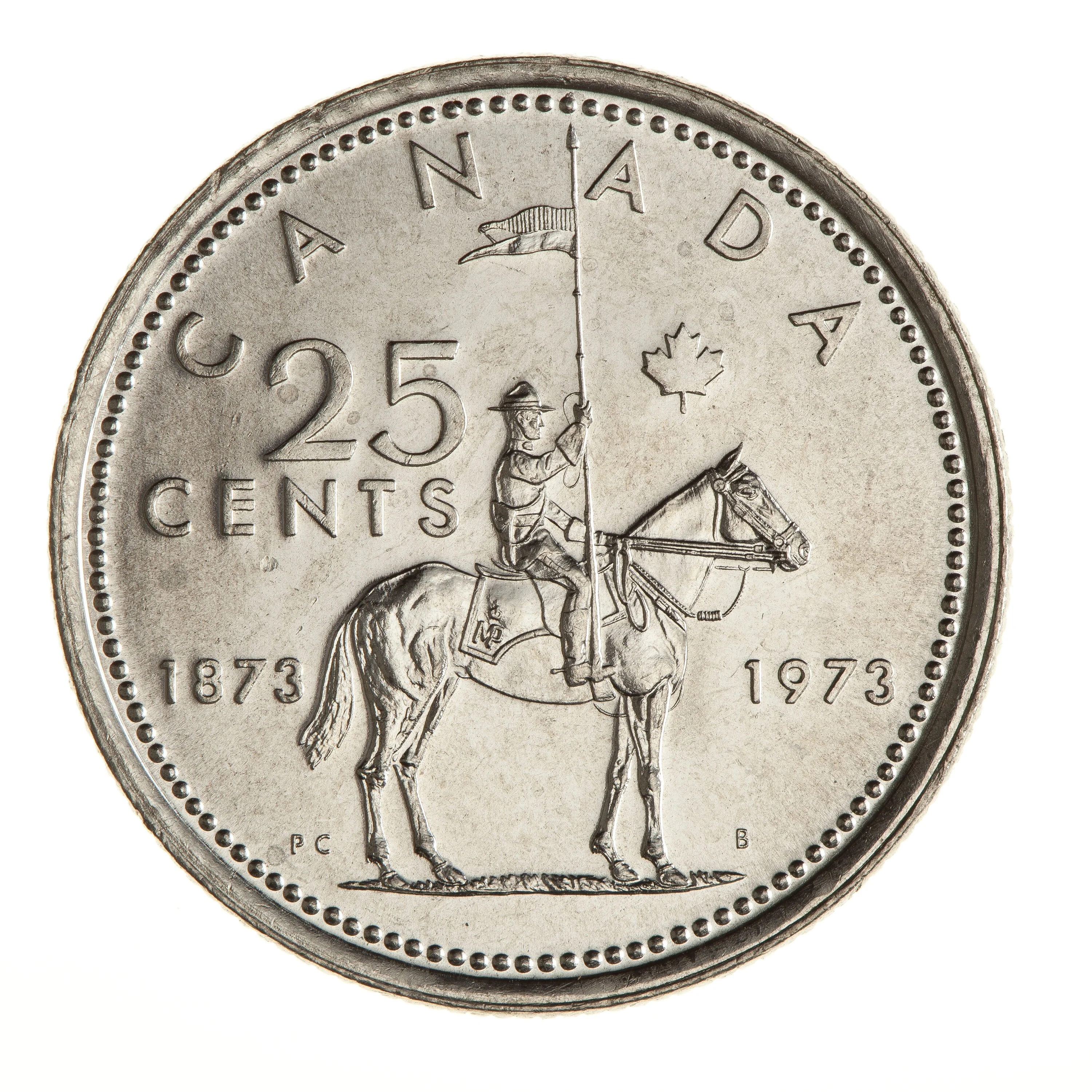 A mounted RCMP officer is encircled by the face value, country name, and the dates 1873-1973.