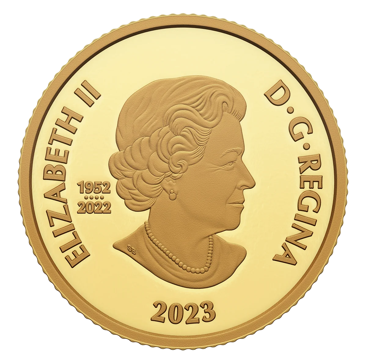 Queen Elizabeth II at 77, facing right, wearing a necklace and earrings. The effigy includes the dates 1952–2022 separated by four pearls, representing her four portraits on Canadian coins.