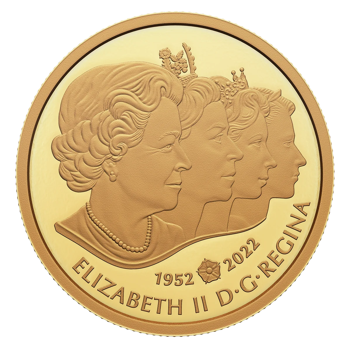 Gold-plated effigies of Queen Elizabeth II on Canadian coins since 1953, facing right, with a Tudor rose between her reign dates.