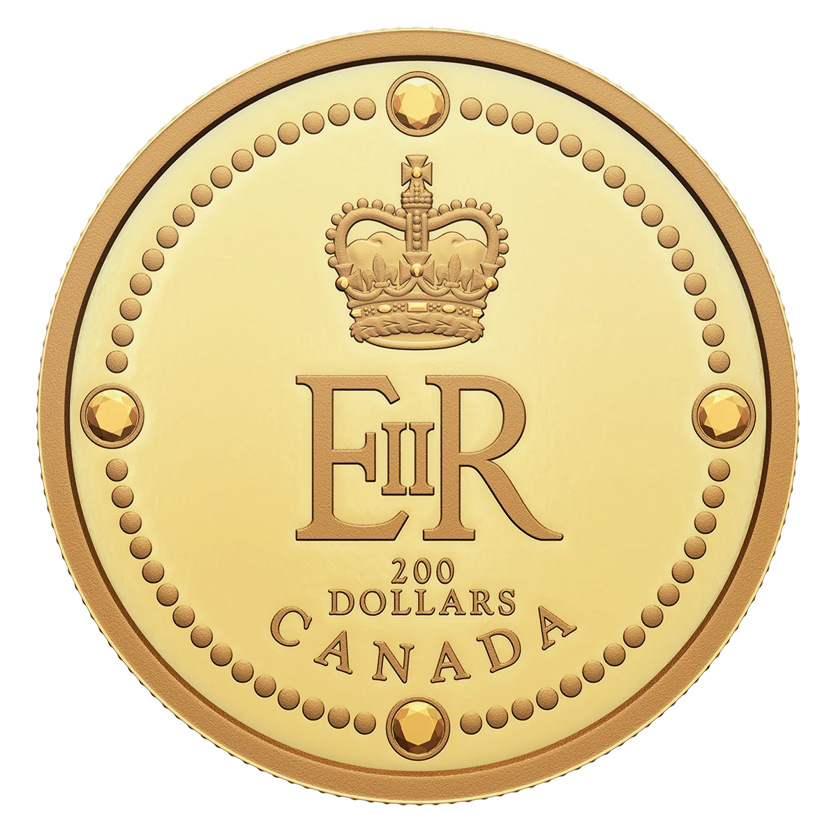 The reverse displays Queen Elizabeth II's Royal Cypher, combining "E II R" with St. Edward's Crown, framed by shapes inspired by the crown's adornments. Four larger shapes represent the effigies on Canadian coins since 1953.