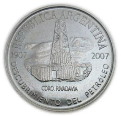 The central imprint features the first oil extraction tower, dated between "1907" and "2007", with the legend "CDRO. RIVADAVIA". The upper arch reads "REPÚBLICA ARGENTINA" and the lower arch reads "DESCUBRIMIENTO DEL PETROLEO".