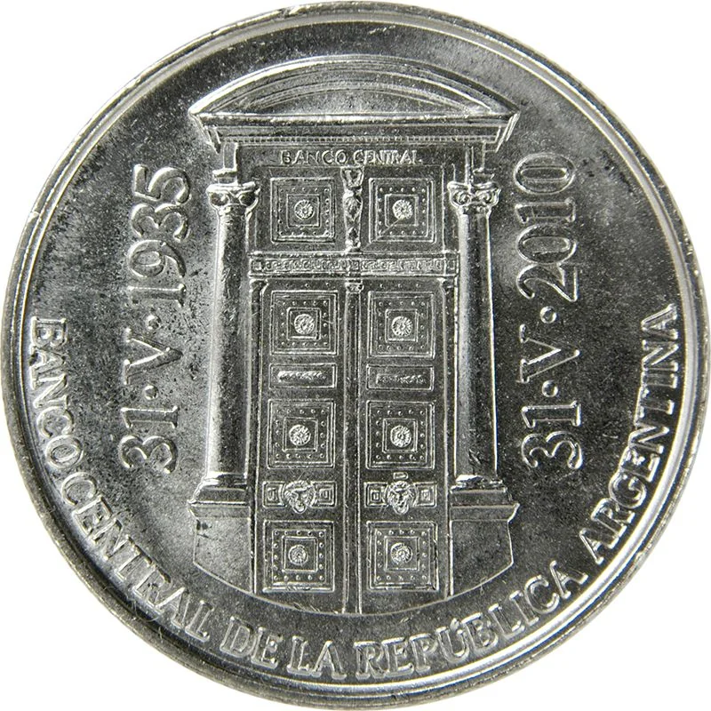 The central door is flanked by its founding date (31/V/1935) and its 75th anniversary (31/V/2010). The arch below reads "BANCO CENTRAL DE LA REPUBLICA ARGENTINA".