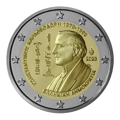 The obverse features a portrait of Constantin Carathéodory (1873-1950) with his name and dates at left, and the year '2023' with a palmette mintmark at right. Below is 'HELLENIC REPUBLIC'. The outer ring depicts the 12 stars of the European flag.