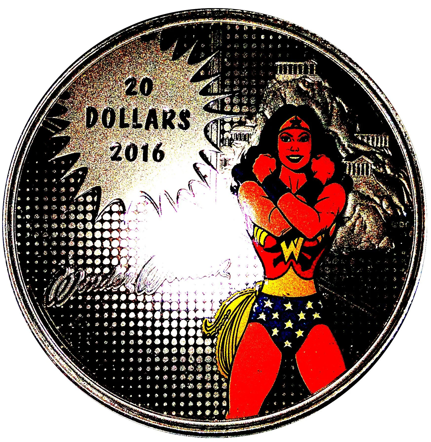 $20, 2016. "Wonder Woman" text left, portrait right.