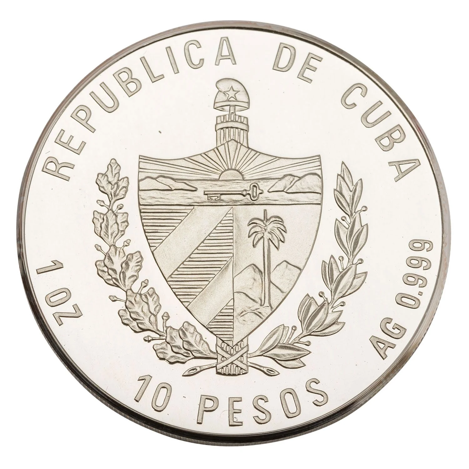 Cuban National Arms, country name curved above, face value below, weight and fineness at sides.