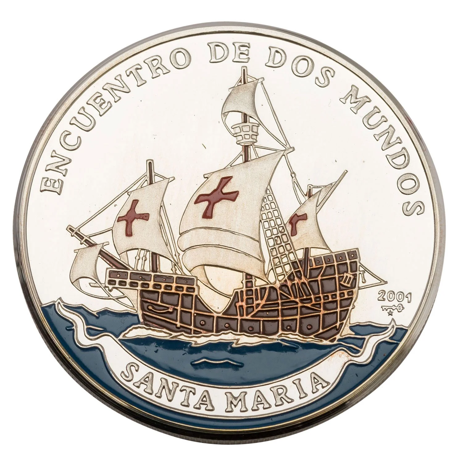 Multicolored Santa Maria sailing left, curved event name above, vessel name in ribbon below, date at lower right.