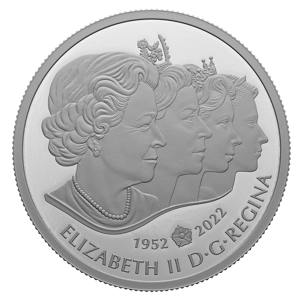 Four effigies of Queen Elizabeth on Canadian coins since 1953, facing right. Tudor rose between reign dates.