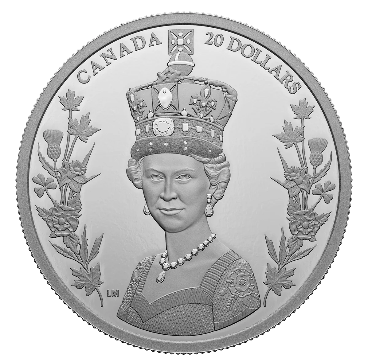 Coronation portrait of Queen Elizabeth II in the Imperial State Crown, framed by the floral emblems of Canada and the UK.
