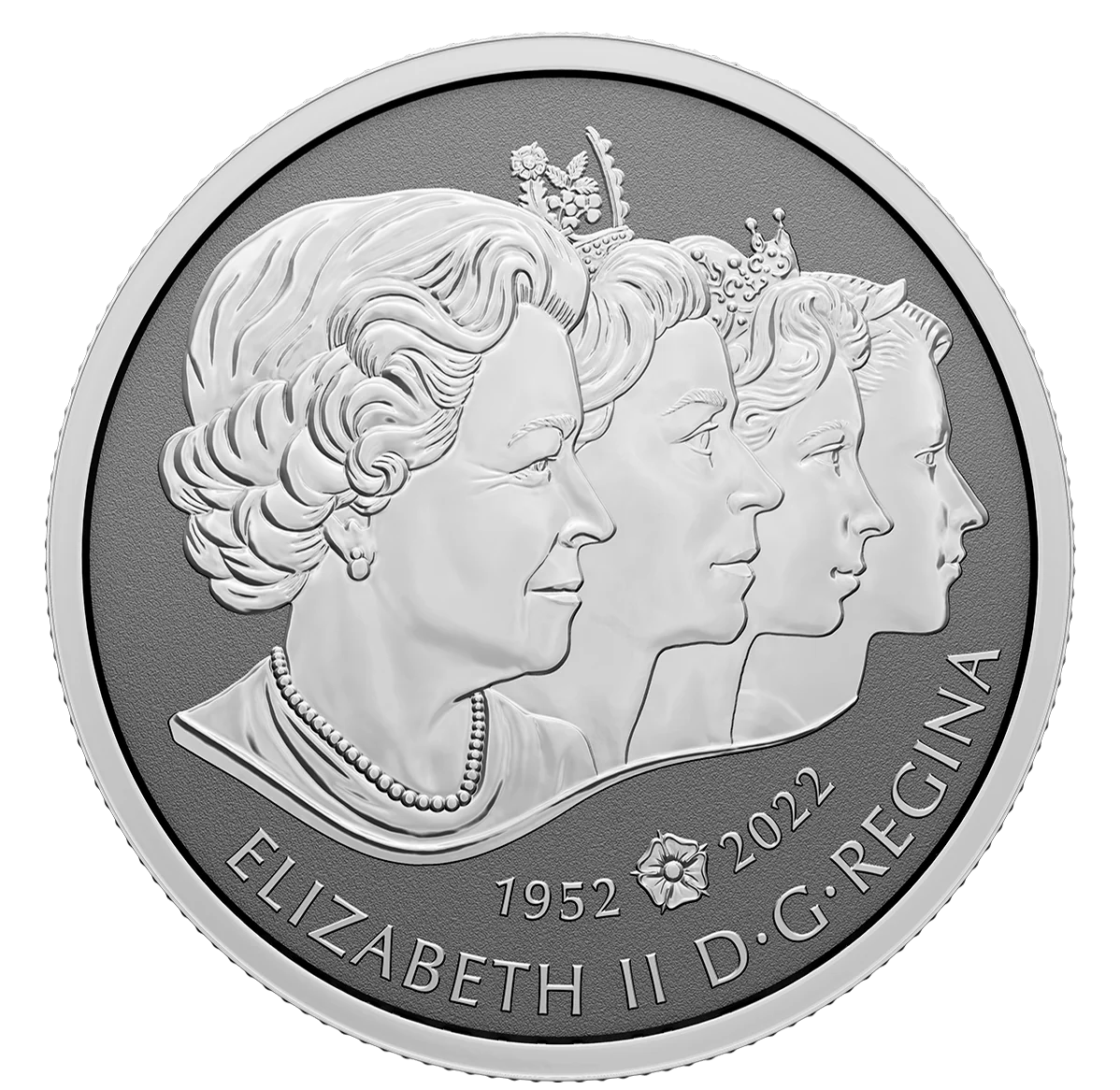 Four effigies of Queen Elizabeth on Canadian coins since 1953, facing right. Tudor rose between reign dates.