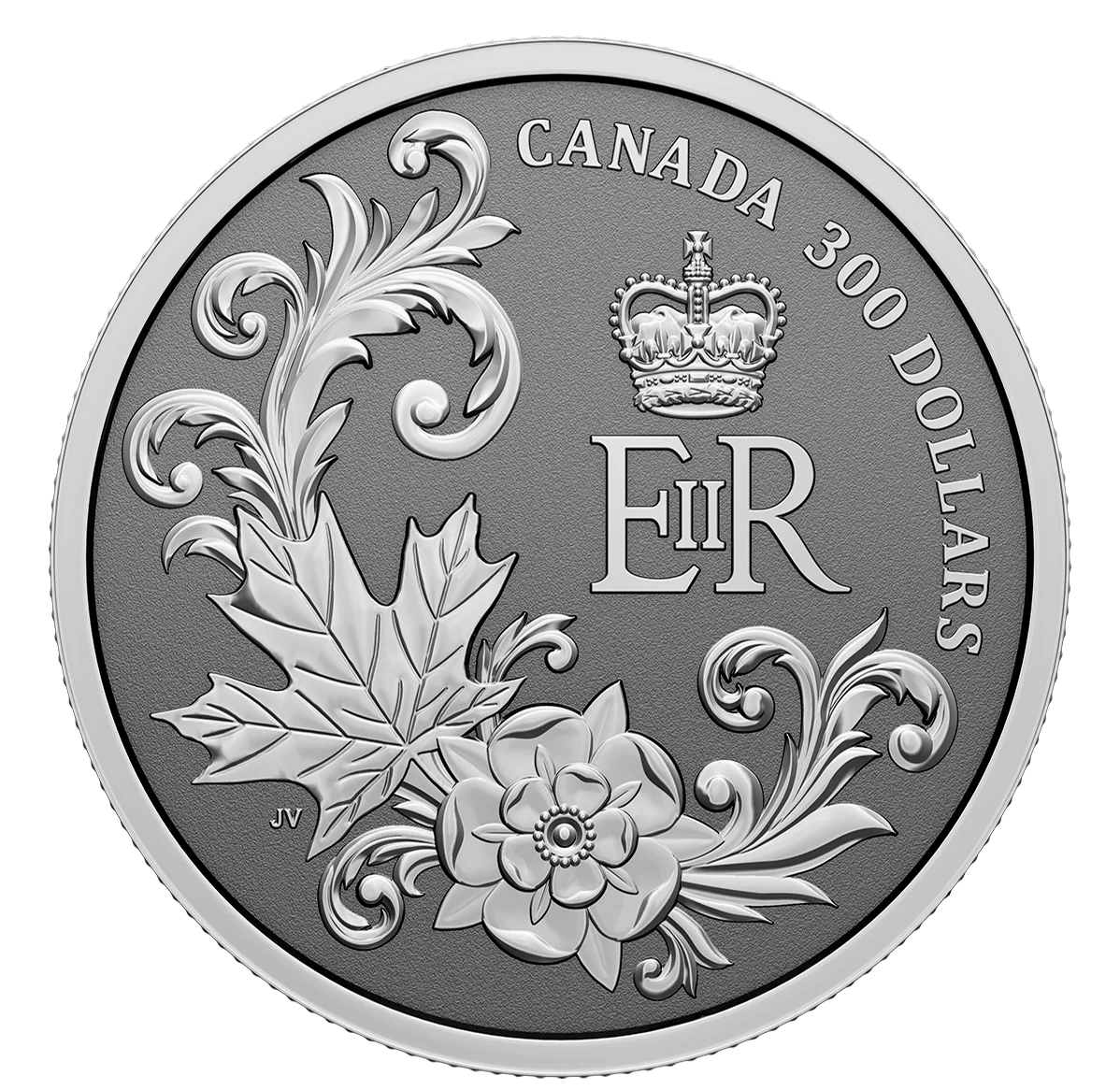 Queen Elizabeth II's cypher with acanthus, a maple leaf, and a Tudor rose.