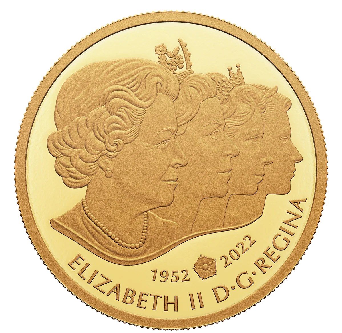 Four effigies of Queen Elizabeth on Canadian coins since 1953, facing right. Tudor rose between reign dates.