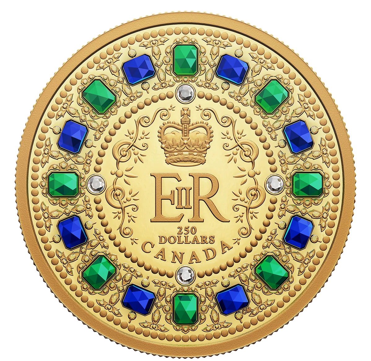Queen Elizabeth II's Royal Cypher, encircled by a top-down depiction of the Imperial State Crown. The reverse features alternating sapphires and emeralds, with four diamonds framing the cypher.