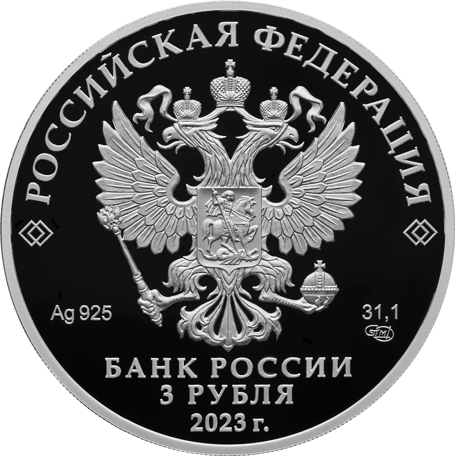 The obverse features the Russian coat of arms, inscriptions for "Russian Federation" and "Bank of Russia," the denomination "3 Roubles," the issue year "2023," the metal's chemical symbol, fineness, mint mark, and fine metal content.
