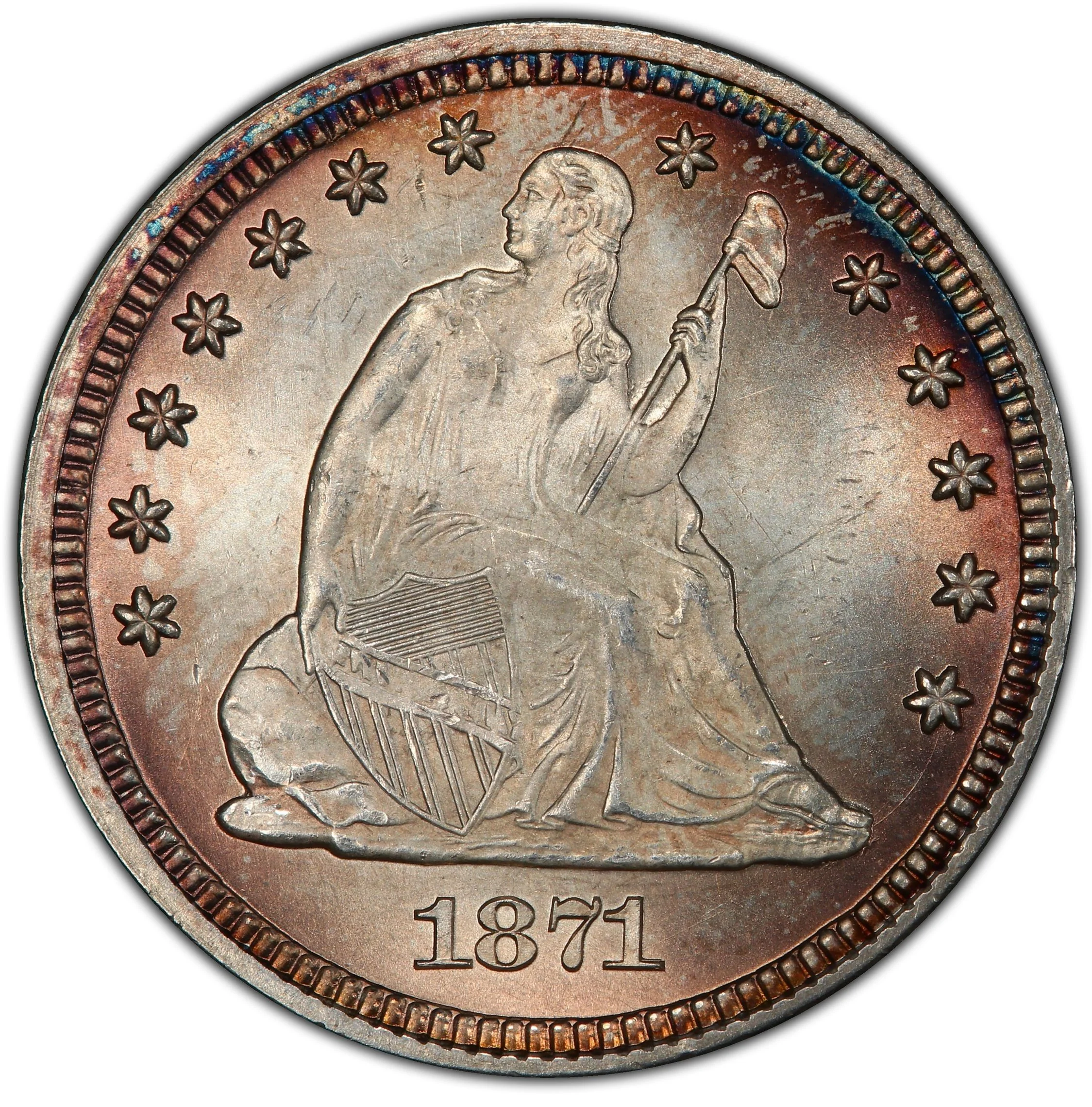 Seated Liberty facing right, holding cap on staff and shield, surrounded by 13 stars.