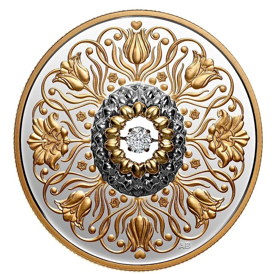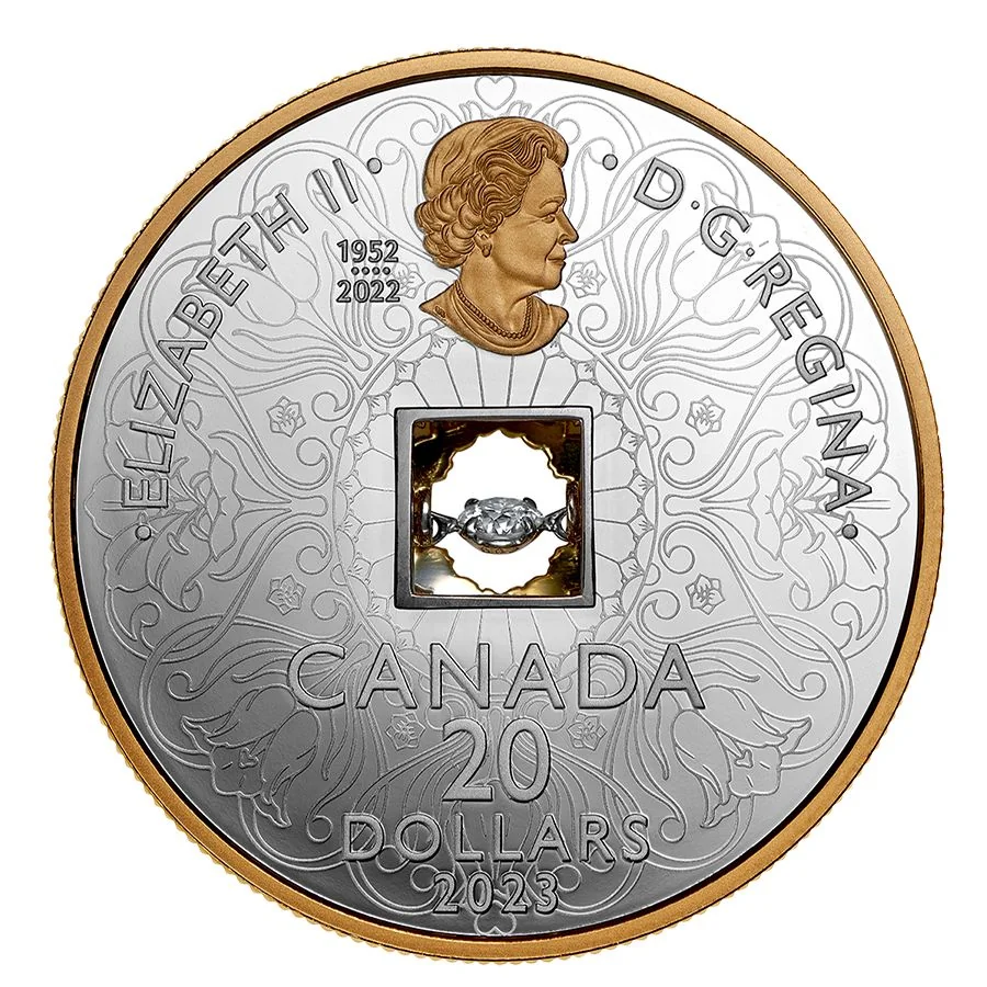 Queen Elizabeth II at 77, facing right. Necklace and earrings. Dates "1952" and "2022" separated by four pearls. Tulip motifs. Square central hole. Denomination, year, and legend around the edge.