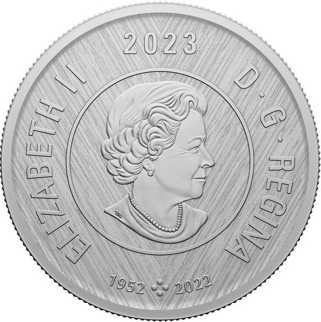 Queen Elizabeth II at 77, facing right, wearing necklace and earrings. Dates "1952" and "2022" are separated by four pearls, representing the effigies on Canadian coins during her reign. Legend and date surround the design.