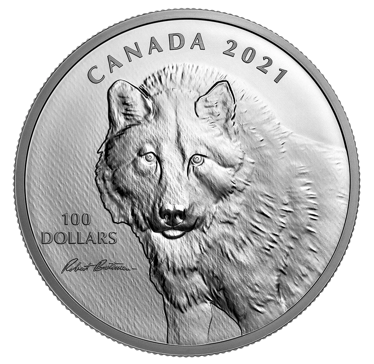 Adapting Robert Bateman’s Wolf Sketch, this coin recreates his pencil strokes. The engraved texture fades to mimic the original shading, with inscriptions for the denomination, signature, and year.
