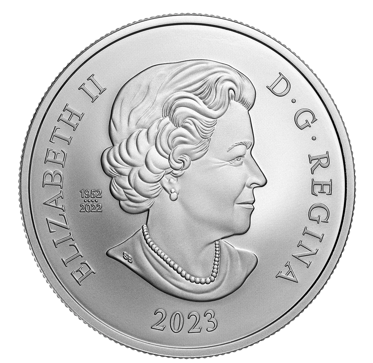 Queen Elizabeth II at 77, facing right, wearing a necklace and earrings. The effigy includes the dates 1952–2022 separated by four pearls, representing her four portraits on Canadian coins.