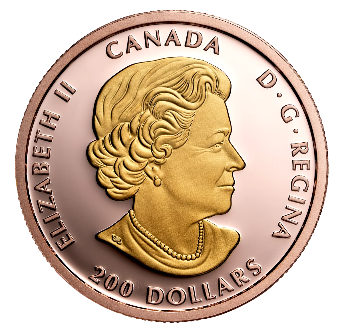 The obverse features a rose gold-plated, bare-headed portrait of Queen Elizabeth II at age 77, facing right and wearing a necklace and earrings.