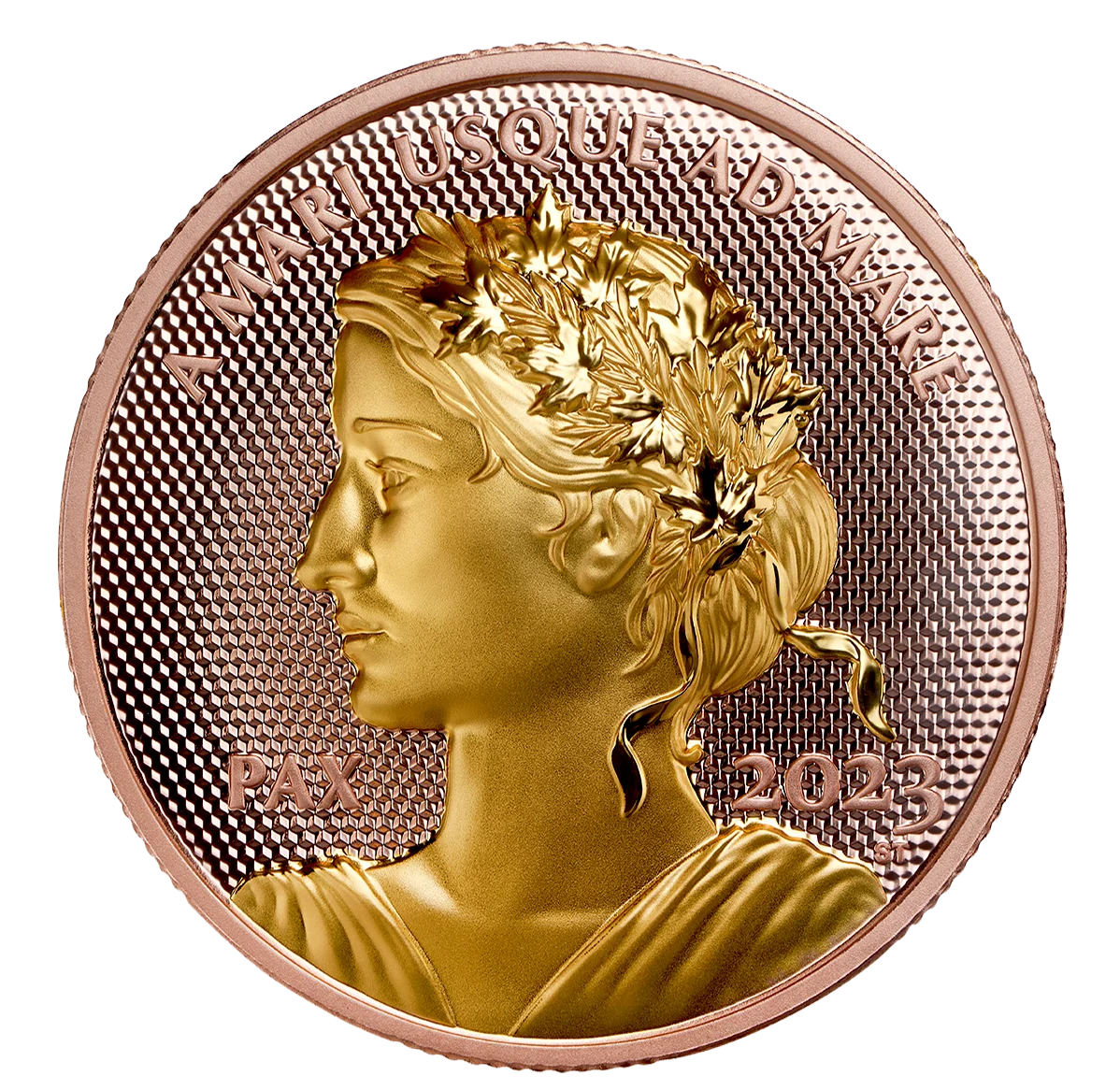 Your Peace Dollar's reverse has selective rose gold plating and a pulsating background. Struck in Ultra High Relief, it features Lady Peace in profile, crowned with maple leaves and olive branches.