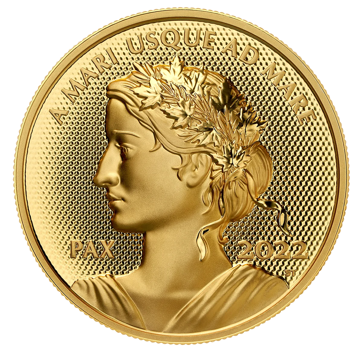 Struck in Ultra High Relief, the reverse features Lady Peace in profile, crowned with maple and olive leaves against a pulsating background.