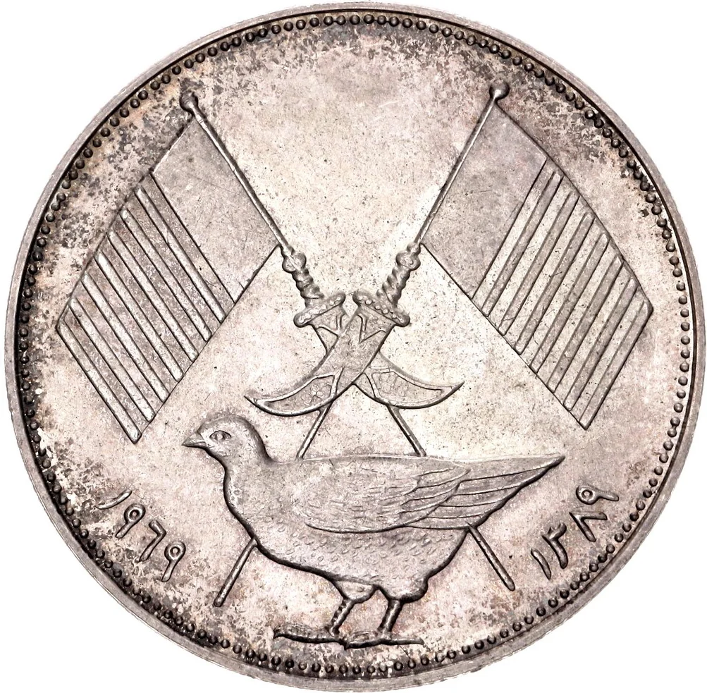 Chicken below state emblem with Arabic dates.