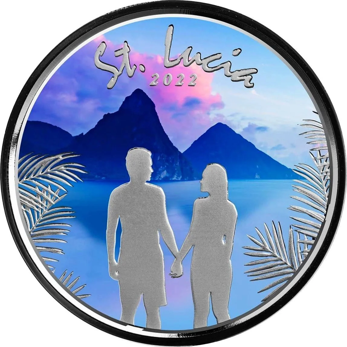A couple holds hands in silhouette against St. Lucia's colorful coastal scenery, featuring the Pitons, palm leaves, and ocean.