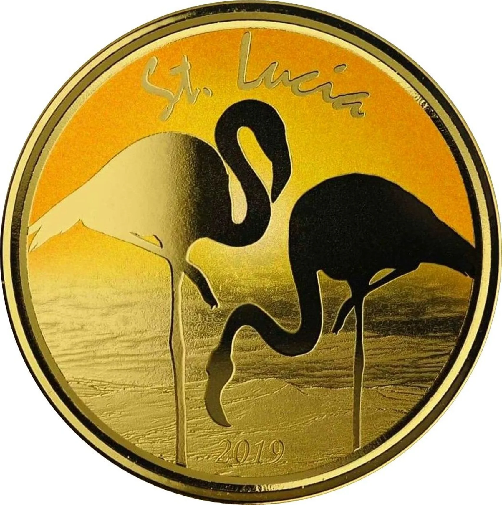 Two flamingos face each other on one leg before a sunset ocean, one gazing forward, the other down, with a partially colored background.