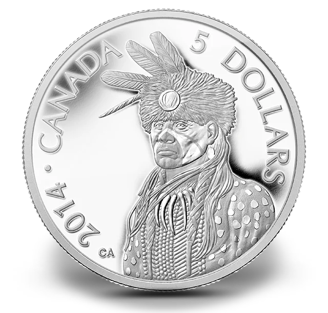Designed by Ojibwa artist Cyril Assiniboine, this coin depicts the cultural hero Nanaboozhoo in human form. Shown in three-quarter profile with face paint, he wears traditional Western Ojibwa dress and a fur headdress with feathers, his long braided hair flowing beneath.