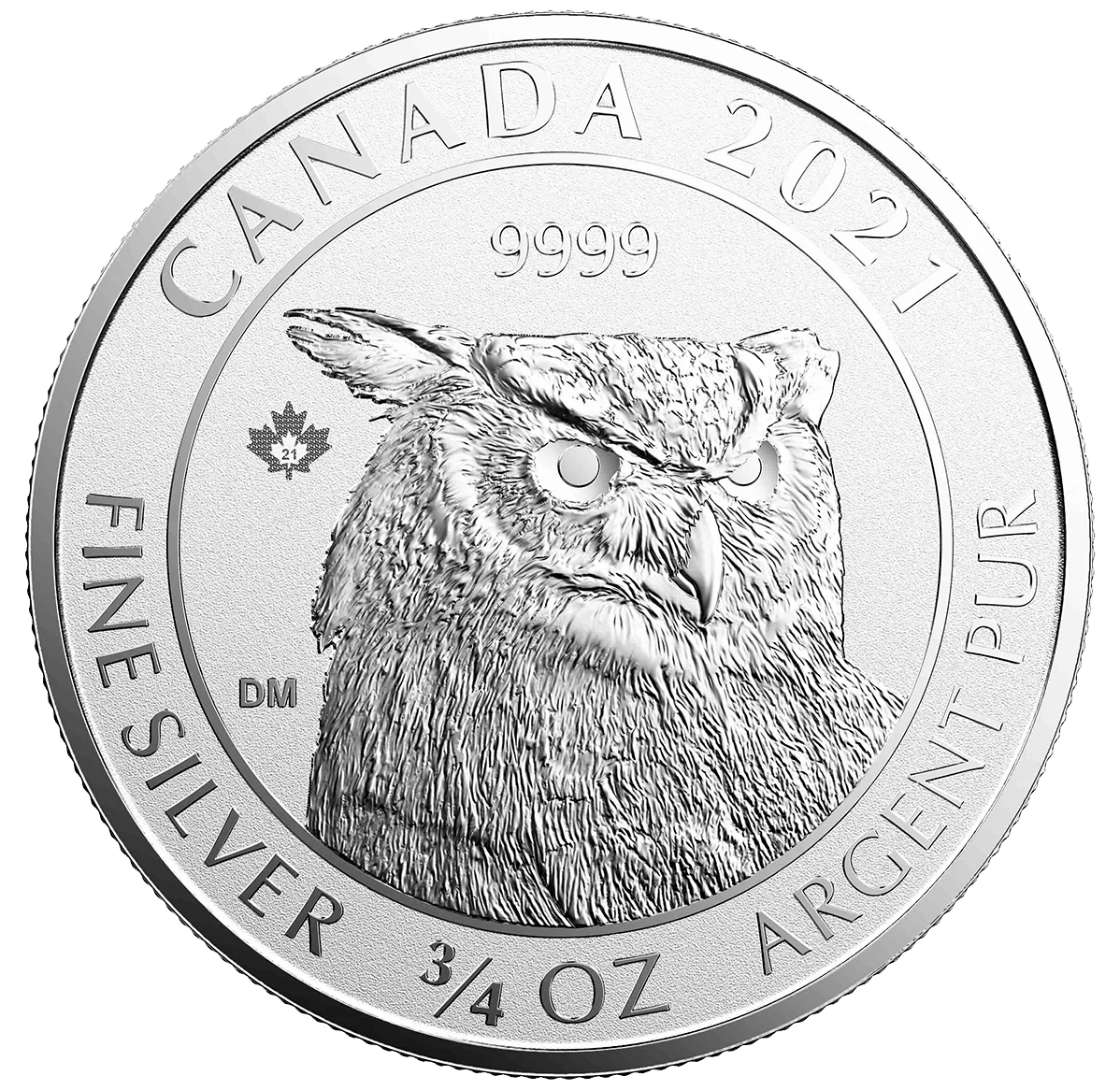 Great-horned owl facing right, maple security mark (21) left.