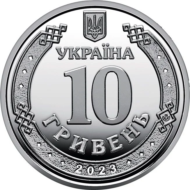 Ukraine's small coat of arms is above. Centered within an old Rus ornament is the semicircular inscription "УКРАЇНА/10/ГРИВЕНЬ." The ornament also displays the issue year 2023 below and the NBU mint mark to the right.