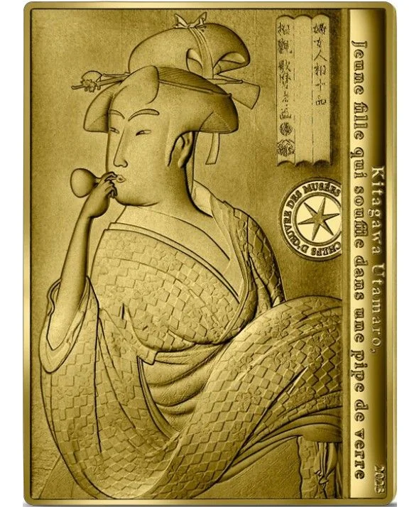 Utamaro's 1794 work depicting a girl blowing a glass pipe, featuring the series' "Museum Masterpiece" stamp.