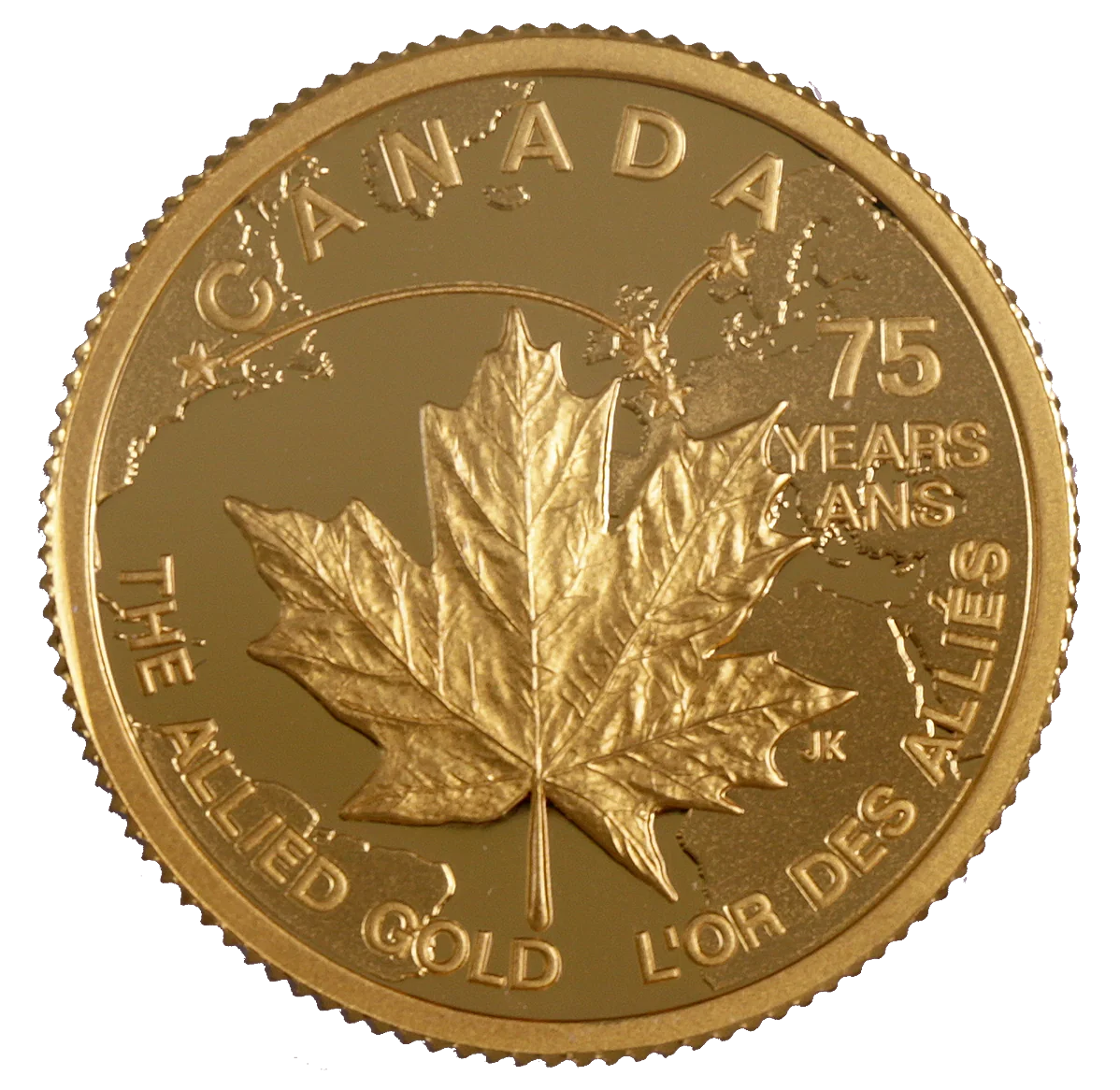 This coin's reverse, by Canadian artist Joel Kimmel, overlays its symbolic design on a stylized map of the northern Atlantic. Four stars mark the wartime gold route from Norway through England and France to Canada. A maple leaf, half Canadian sugar maple and half Norway maple, is engraved across the map.