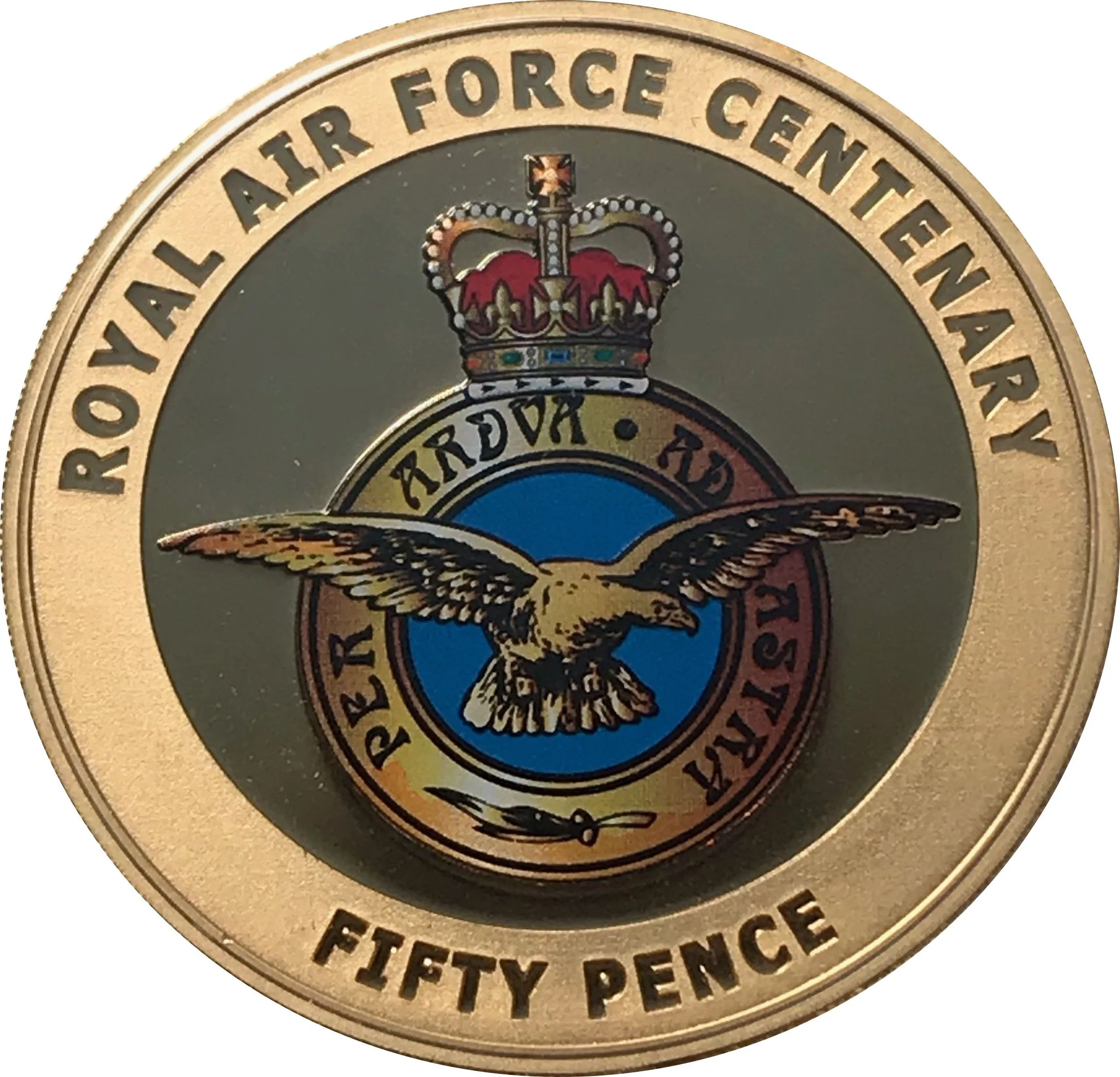 RAF badge: a crowned eagle in a blue circle, surrounded by the motto "Per Ardua Ad Astra," centered on a shiny disc within a duller ring.