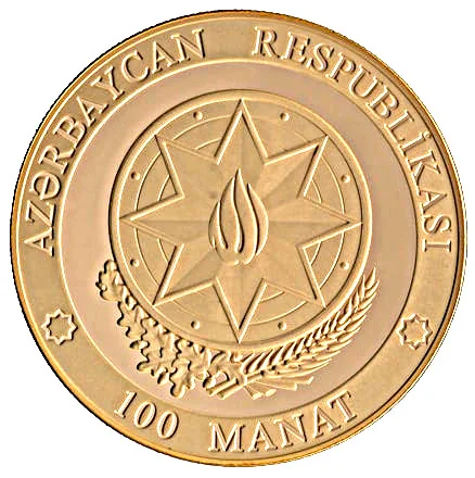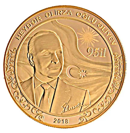 A portrait of Heydar Aliyev before the Azerbaijani flag, with the sun shining above.