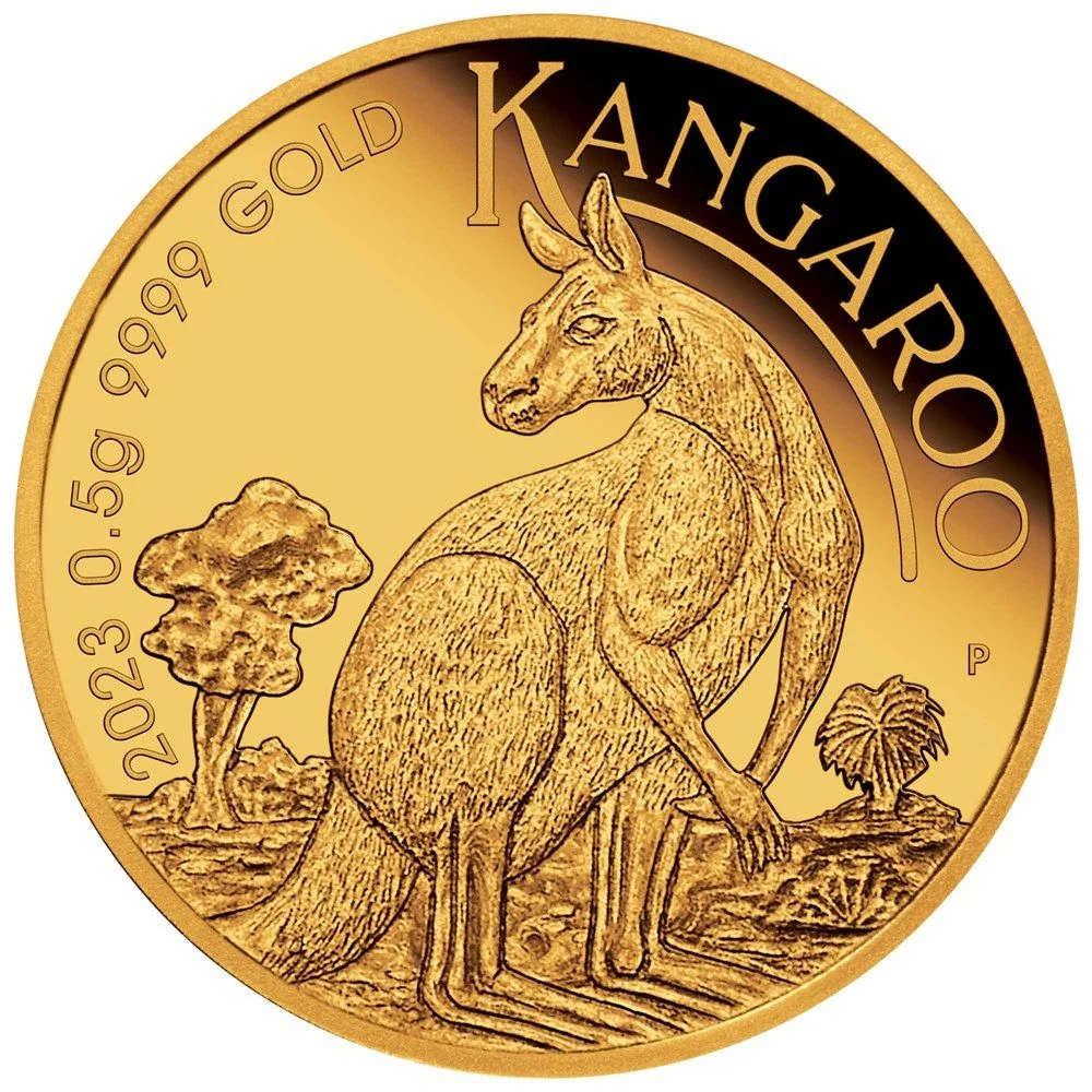 A kangaroo looks over its shoulder amid eucalyptus and grass trees, with "KANGAROO" and The Perth Mint's P mintmark.