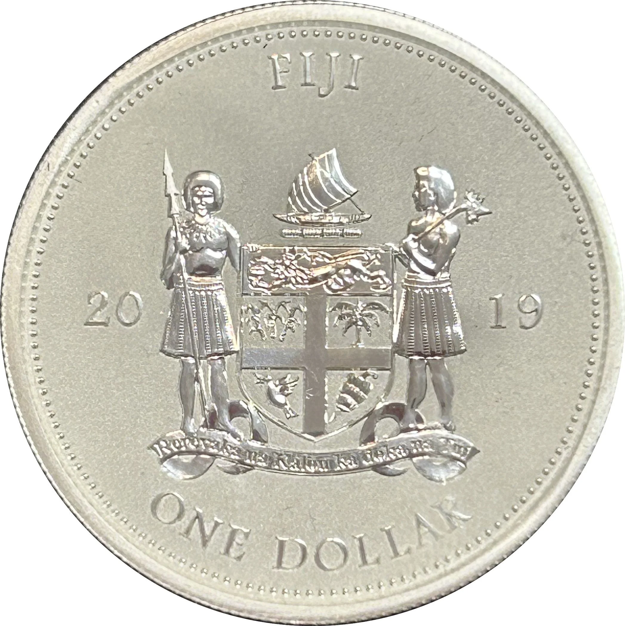 Description: The Fijian coat of arms features a heraldic shield with a golden lion holding a cocoa pod, sugarcane, a coconut palm, a dove, and bananas, topped by a Fijian canoe and supported by two Fijian warriors.
