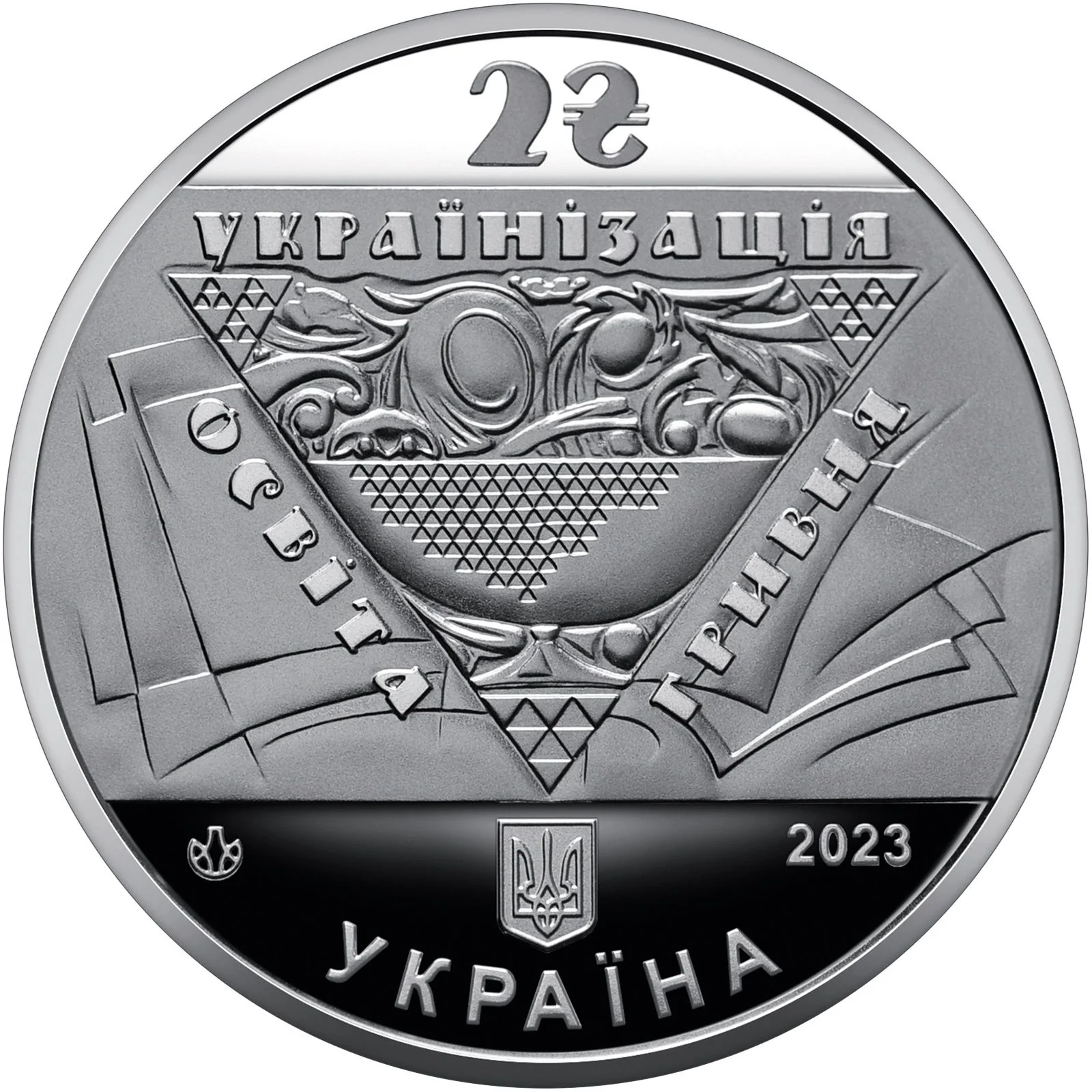 On a mirrored background: Ukraine's small coat of arms and the word УКРАЇНА. On the right is the year 2023. Centered, over stylized flags, is George Narbut's triangular vignette, symbolizing the cultural and economic prosperity of the Hetmanate. It frames the inscriptions: УКРАЇНІЗАЦІЯ (top), ОСВІТА and ГРИВНЯ (sides). Above is the denomination "2" and the hryvnia sign. Below left is the logo of the Banknote and Mint of the National Bank of Ukraine.