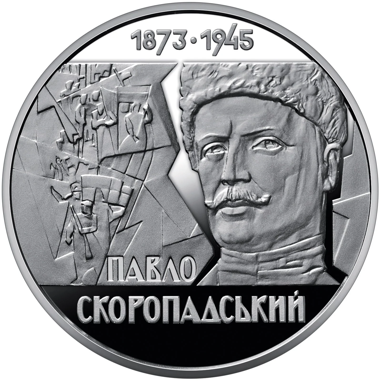 A portrait of Hetman Pavlo Skoropadskyi (right) beside symbols of the Ukrainian Revolution. Above, on a mirrored background, are his life dates 1873 • 1945; below, the inscription ПАВЛО/СКОРОПАДСЬКИЙ.