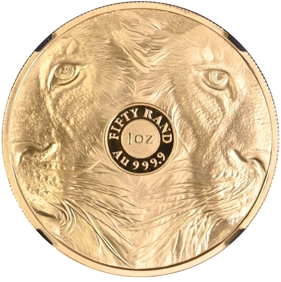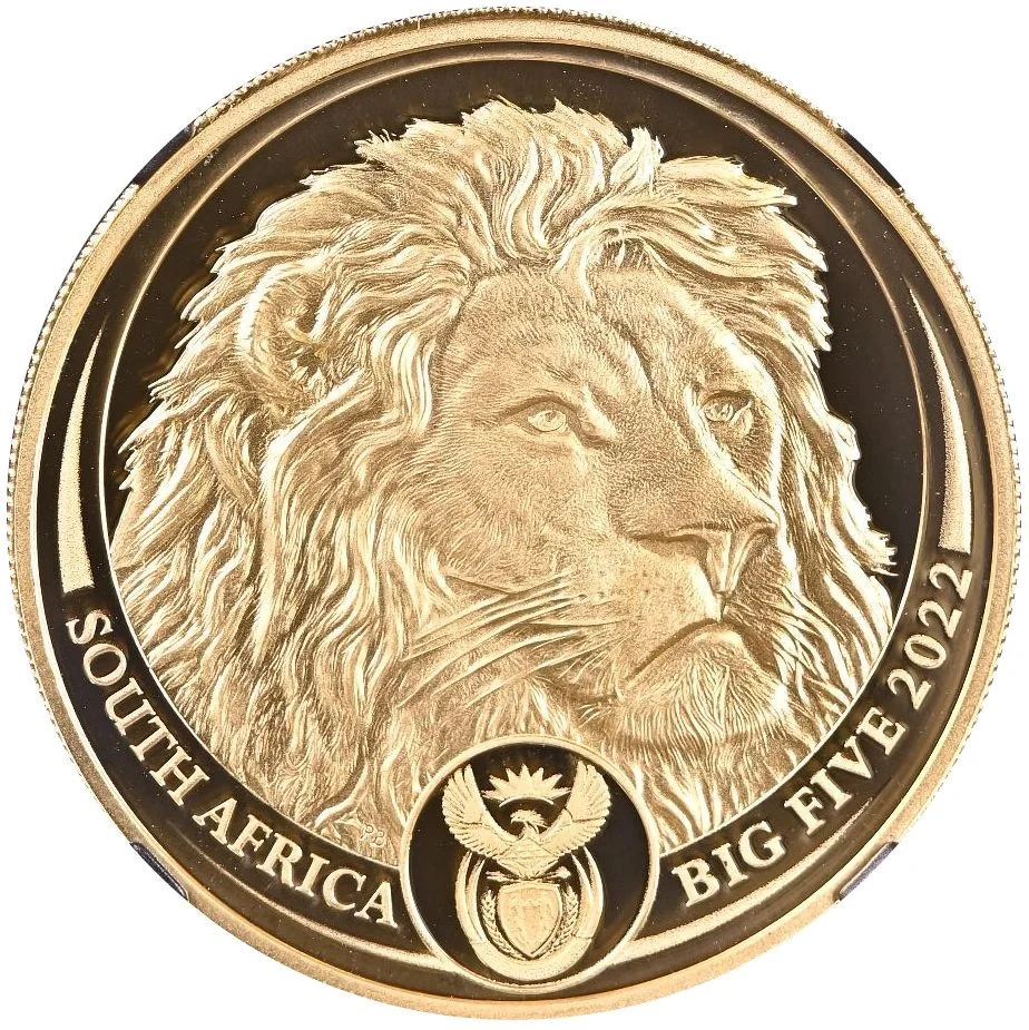 Frontal lion image with South African coat of arms centered below, flanked by lettering.