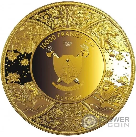 Cameroon's coat of arms centered, surrounded by floral circles.