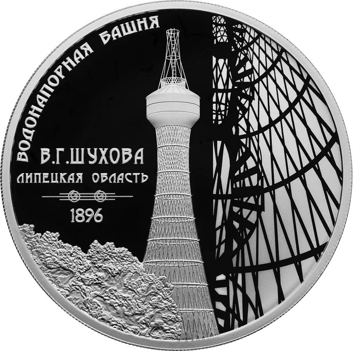 The reverse features a matte-finished relief of the water tower above trees, with its construction details on the right. On the left are the inscriptions: ‘ВОДОНАПОРНАЯ БАШНЯ’ above, and ‘В.Г. ШУХОВА’, ‘ЛИПЕЦКАЯ ОБЛАСТЬ’, and the year ‘1896’ below.