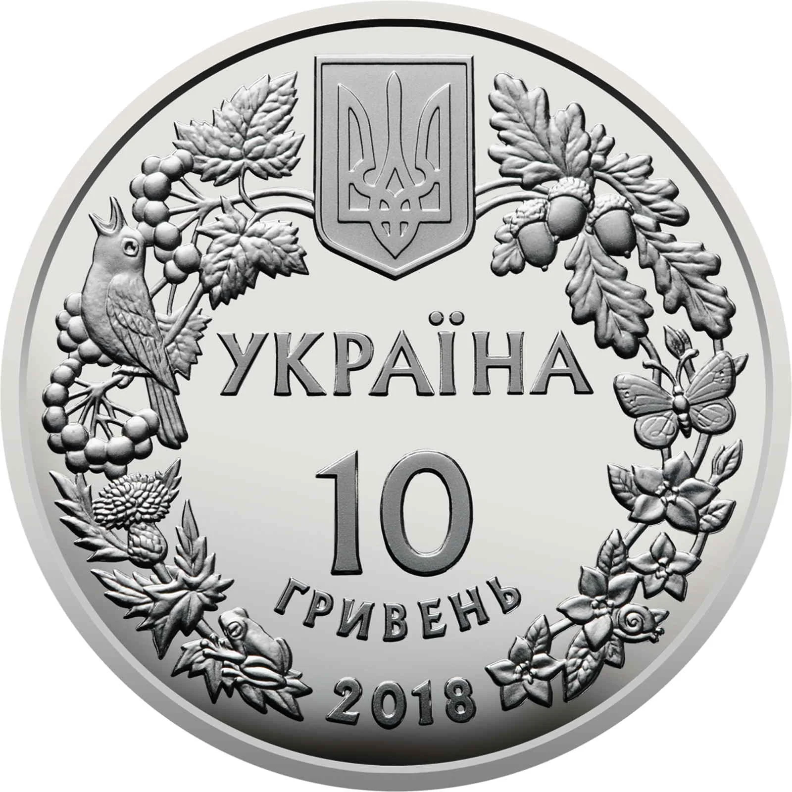 Ukraine's small coat of arms and the inscriptions УКРАЇНА/10/ГРИВЕНЬ/2018 are set within a wreath of flora and fauna.