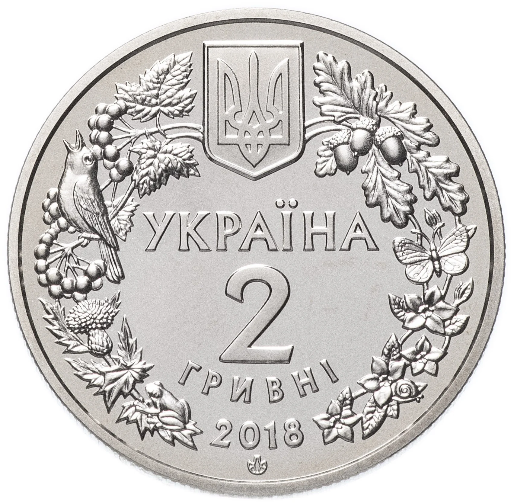 This coin features Ukraine's small coat of arms within a wreath of flora and fauna, inscribed with УКРАЇНА/2/ГРИВНІ/2018 and the mint mark of the NBU Mint.