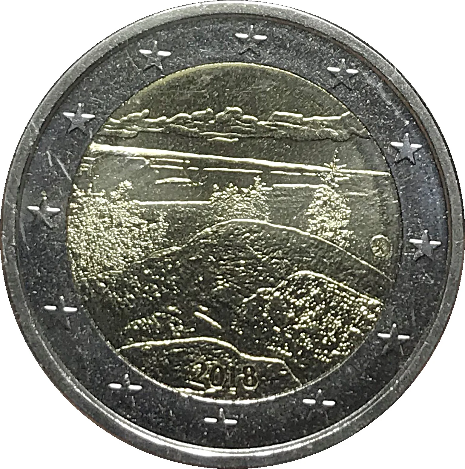 The design depicts Finland's Koli landscape from above. The date is centered at the bottom, with 'FI' at the lower left and the mintmark at the lower right. The outer ring features the 12 stars of the European flag.