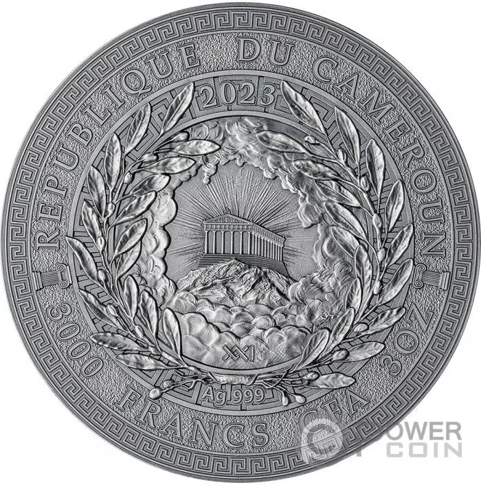 Temple on Mount Olympus encircled by a wreath, with a meander border.