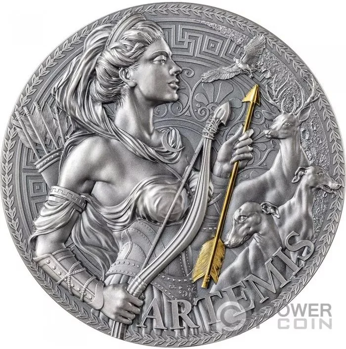 Artemis holding a bow, with a dog, deer, and bird. Wreath on the rim.